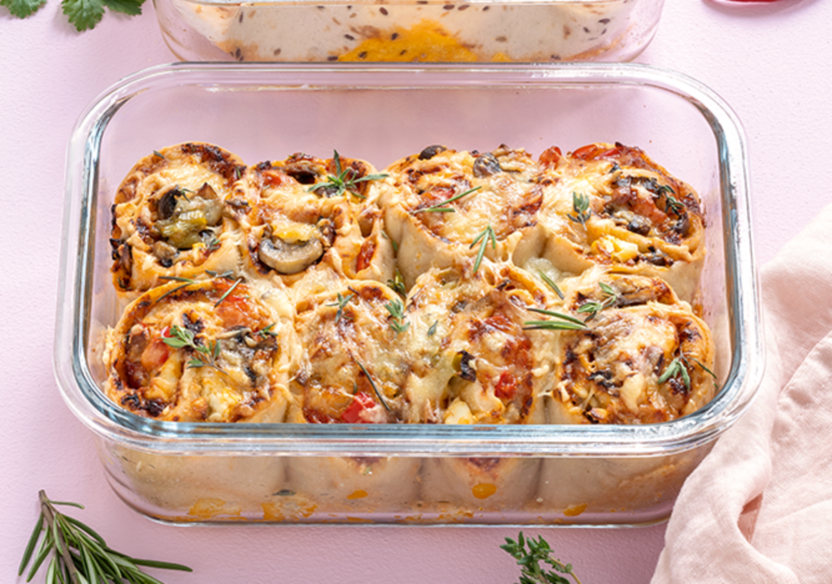 Rull deigen sammen og skjær 8 pizzaruller. Smør PremiaGlass 1,5 l med olje. Pizzarullene legges side om side i PremiaGlass 1,5 l med snittflaten opp.